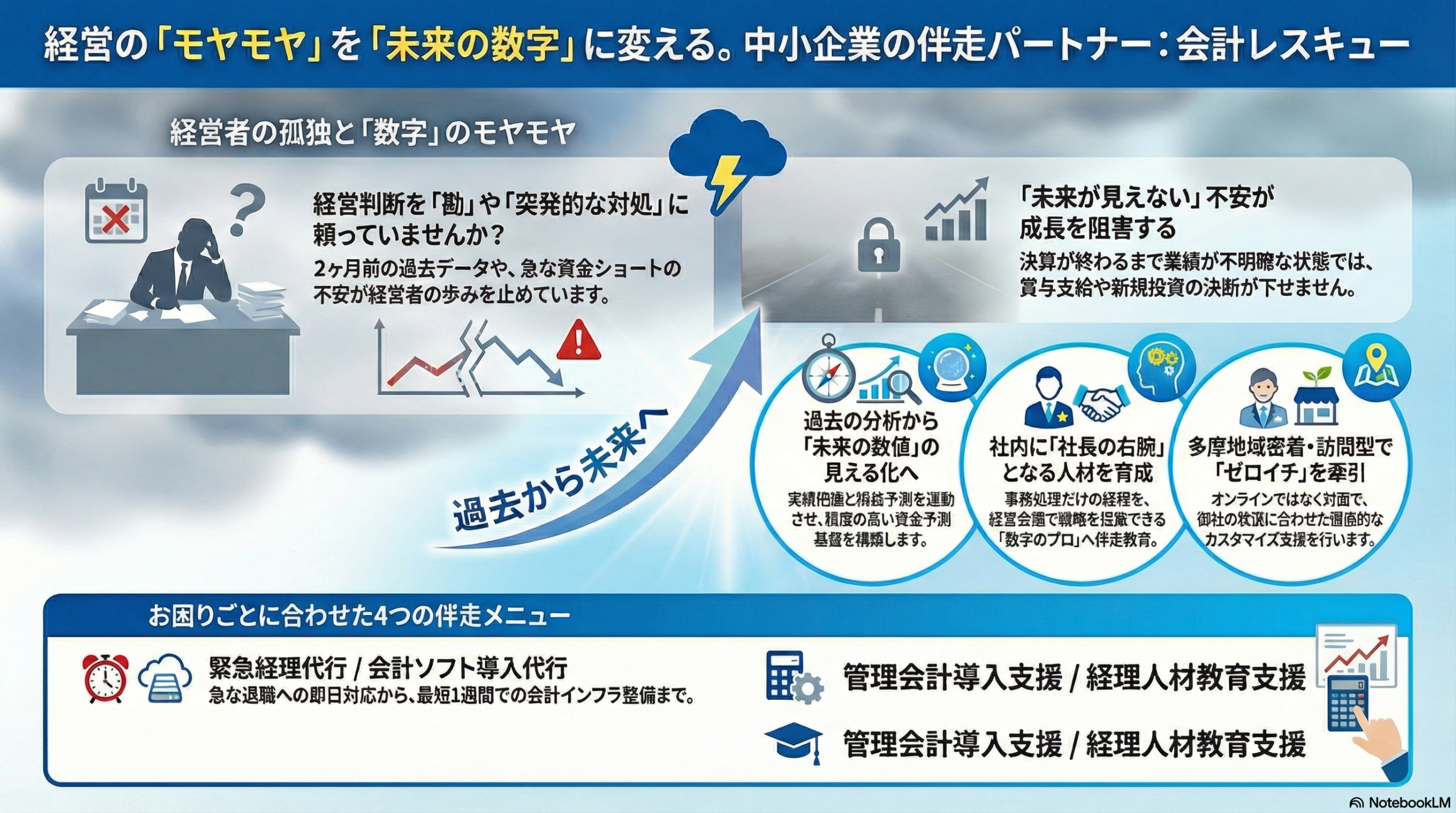 会計レスキューは、立川を拠点に多摩地域の中小企業の 『未来を知るための会計』 の基盤づくりを訪問型サービスで伴走支援しています。