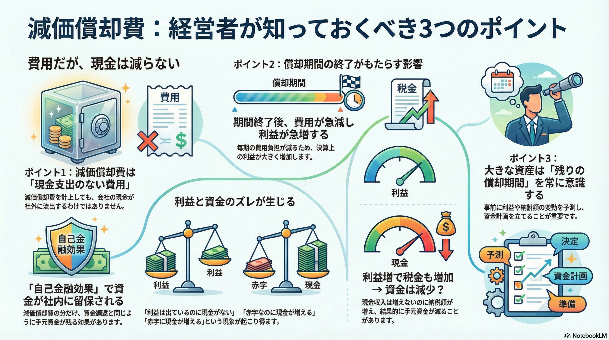 会計用語 減価償却費と聞いて経営者が考えておきたいこと3選 「減価償却費」と聞いて何を思い浮かべますでしょうか?ここでは細かな用語の定義は後回しにして、どんなことに注意すべきか、「経営者目線」から減価償却費について考えていきます。【ポイント1】「現金支出が伴わない費用である」費用は通常、資金の流出を... 2026.01.17 会計用語
